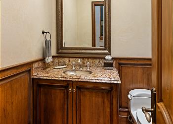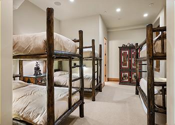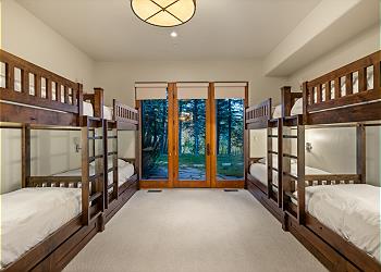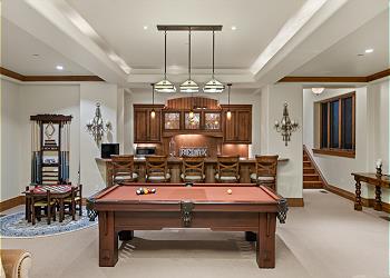 The lower level of the home includes five additional guest bedrooms — two king ensuites, one double twin/split king ensuite with steam shower and walkout to the hot tub, one three-twin bunkroom ensuite, and one four-twin bunkroom ensuite which includes and shower/tub combo as well as a walk-in shower. The extensive family area on this level includes an arcade, billiards, gym equipment, and a theater.