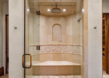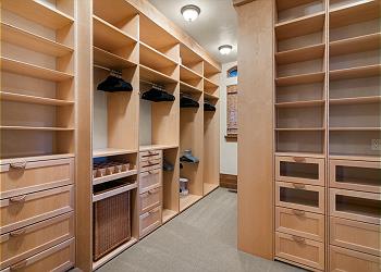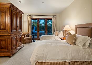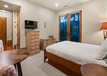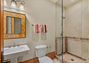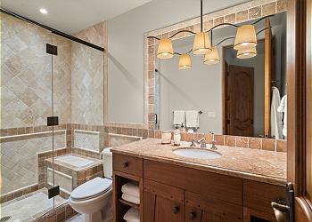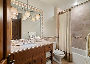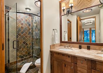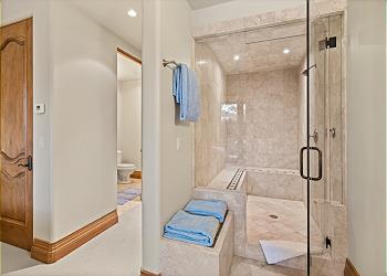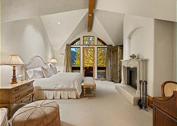 The east staircase leads up to the guest primary suite or down to the lower living and guest rooms. The guest primary suite is furnished with a private balcony, gas fireplace, walk-in closet, and an ensuite with double vanity, jetted soaking tub, and steam shower.