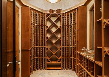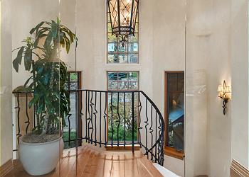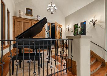 The west wing houses a second staircase from the lower level, leading to the primary suite with king bed, gas fireplace, sitting area, his and hers closets, bidet, steam shower, and soaking tub. From the primary suite, take the iron spiral staircase to the home office which hosts two balconies, a gas fireplace, a conference area, and a three-quarter bath.